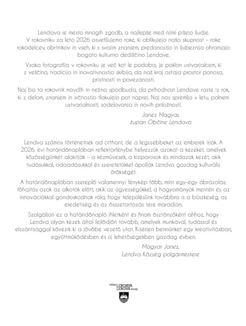Ob izteku leta 2025 je Občina Lendava izdala novo serijo rokovnikov in koledarjev za leto 2026, ki predstavljajo poklon bogati ustvarjalnosti ljudi in slikovitim krajem naše občine.