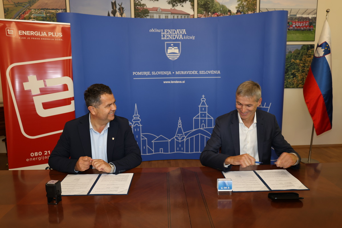 Župan Občine Lendava Janez Magyar in direktor družbe Energija plus mag. Alan Perc sta danes v prostorih Mestne hiše podpisala pogodbo za postavitev treh novih sončnih elektrarn (MSE) na občinskih objektih.