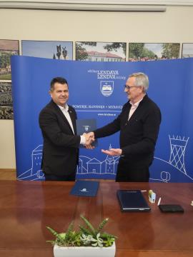 V prostorih Mestne hiše sta danes, 21. februarja 2024, župan Občine Lendava Janez Magyar in Stanko Srša, predsednik zadruge Dolinka inženiring Beltinci, podpisala pogodbo za obnovo vaško-gasilskega doma v Dolnjem Lakošu.